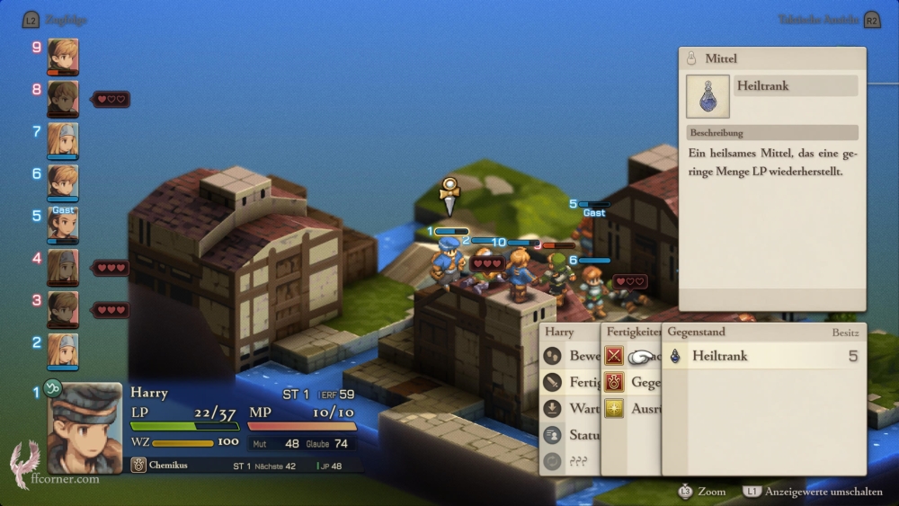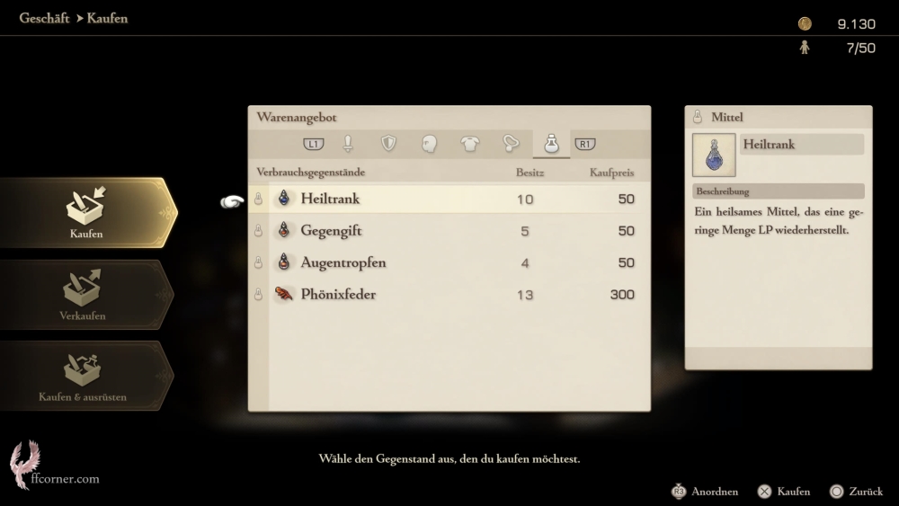 Rüstet den Knappen als ersten, den Chemikus als Zweit-Job aus und schaltet mit Euren Startpunkten immer unbedingt den „Steinwurf“ des Knappen und den „Heiltrank“ des Chemikanten frei. Achtet darauf, stets genügend Heiltränke im Inventar zu haben. Sie lassen sich nach dem Prolog in den Geschäften der freigeschalteten Städte für 50 Gil kaufen.
