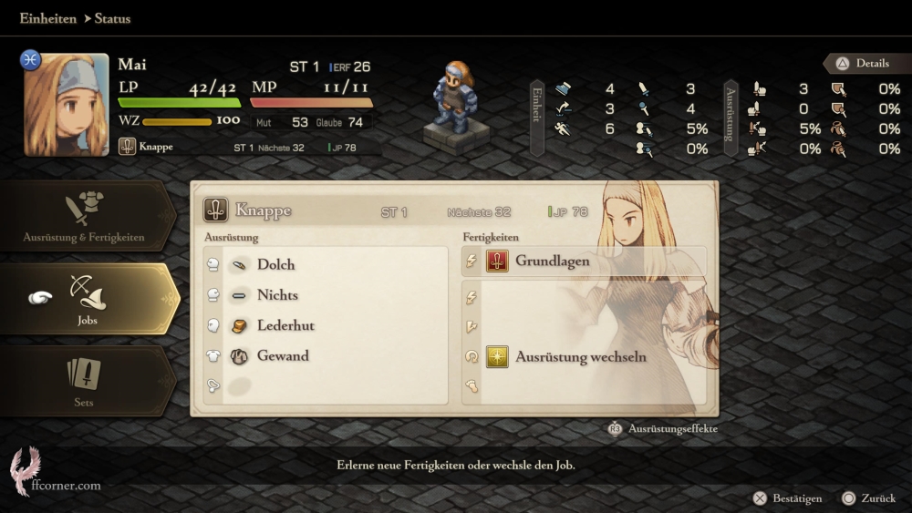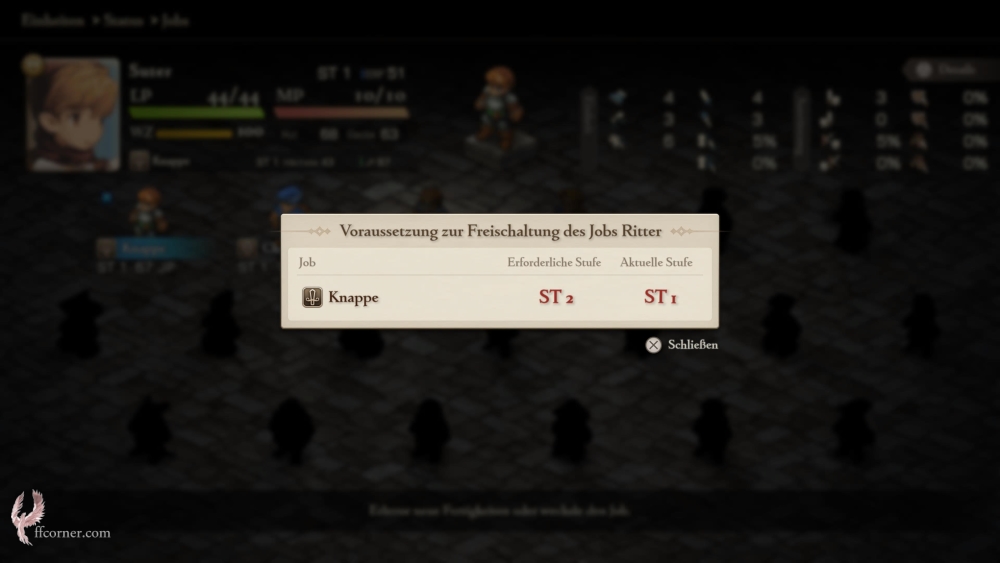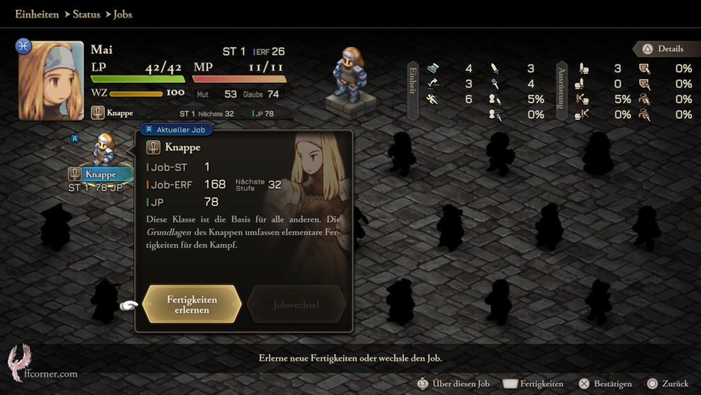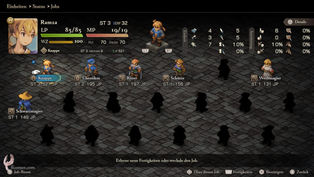 Knappen bilden die Basis der physischen Job-Klassen, während Chemikanten als die Basis der magischen Jobs gelten. JP sammelt Ihr immer für Euren Haupt-Job, egal, ob Ihr dessen Fähigkeiten oder die des Zweit-Jobs im Kampf benutzt. Da aber jeder Charakter Fertigkeiten aus beiden Jobs erlernen sollte, sollte auch jede Einheit ein paar Kämpfe in beiden Jobs bestreiten, egal, ob Ihr sie später als physische oder als Magie-Klasse spielen wollt.