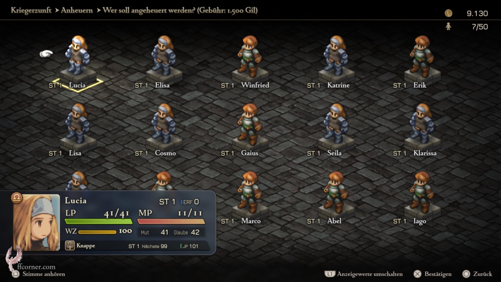 Abgesehen davon unterscheiden die Einheiten sich in Sternzeichen, Geschlecht, ihren Namen und der Stimme. Nehmt mit, wen Ihr wollt. Die Namen der Rekruten lassen sich (ebenfalls in der Kriegerzunft) jederzeit ändern.