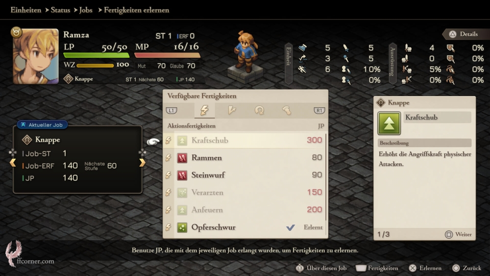 Beachtet: Ramza verfügt als Knappe über individuelle Fähigkeiten, die „normale“ Knappen nicht lernen können. Sucht also bei den anderen Knappen nicht nach Skills wie „Anfeuern“ oder „Opferschwur“.
