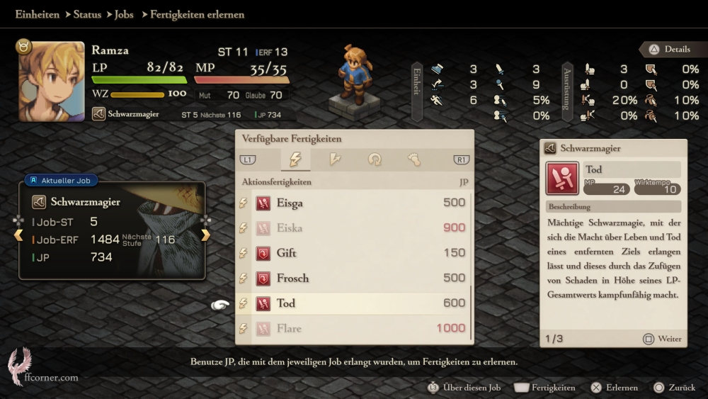 Obwohl Final Fantasy Tactics: The Ivalice Chronicles sich Mühe gibt, Euch Stück für Stück in die Welt und das Spielsystem einzuführen, lässt sich an der Tatsache nichts ändern, dass es ein komplexes Spiel mit vielen Variablen ist, das sich am Anfang leicht überwältigend anfühlen kann. Mir ging es jedenfalls so, obwohl ich es damals, 1997, wirklich intensiv gespielt habe. Aber das ist eben lange her. Auch wenn sich die Musik und das Jobsystem wie ein Nach-Hause-Kommen anfühlt – die Flut an Charakteren und Fertigkeiten wirft doch schnell viele Fragen auf. Wie bekomme ich die coolsten Jobs? Welche Fähigkeiten sind anfangs wichtig? Und welcher Build ist der beste für Ramza?