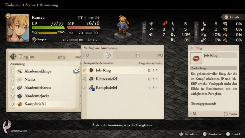 Seid Ihr in Besitz der Deluxe-Variante des Spiels, habt Ihr als Bonus-Item einen Job-Ring bekommen, den Ihr nacheinander jeder Einheit anlegen könnt, die noch nicht über die Fertigkeit „Bonus-JP“ des Knappen verfügt. Sobald eine Einheit diese erlernt hat, ist der Ring für sie wertlos, da der Bonus nicht stapelbar ist.