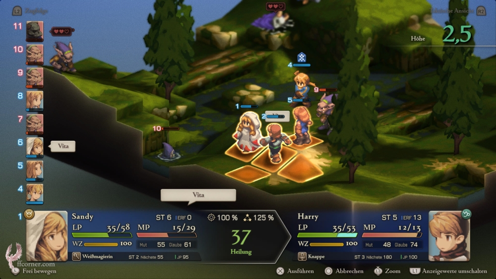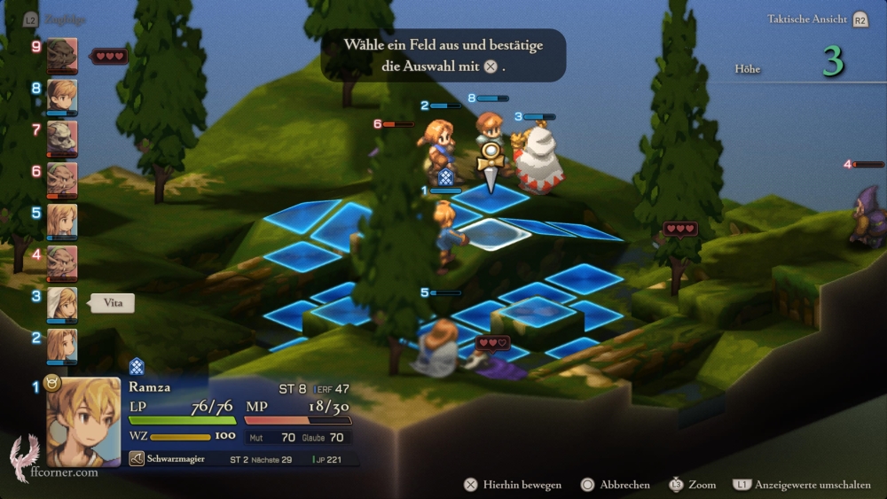 Anders sieht es bei Ramza und den Gast-Charakteren aus. Sind diese kampfunfähig, könnt Ihr dies ignorieren, wenn sich abzeichnet, dass Ihr den Kampf ohne sie gewinnen könnt. Nach der Schlacht findet Ihr sowohl Ramza als auch Eure verstorbenen Gäste unversehrt zwischen den anderen Einheiten im Menü wieder.