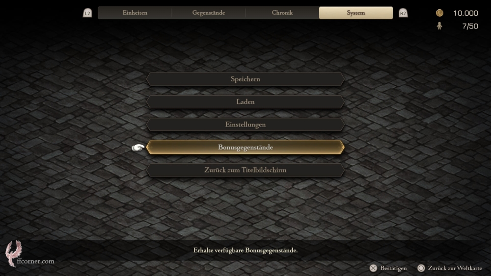 Sobald Ihr den Prolog und eine weitere Schlacht durchgespielt habt, sagt Euch das System Bescheid, dass Ihr jetzt das Hauptmenü aufrufen könnt. Wechselt dort in den Reiter System und von da ins Menü „Bonusgegenstände“. Dort könnt Ihr die Items freischalten und findet sie anschließend in Eurem Inventar.