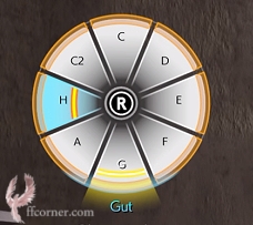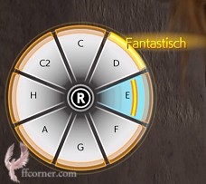 Wann Ihr welche Note spielen müsst, wird durch die Färbung der Tasten angezeigt. Ist eine Taste (bzw. ein „Kuchenstück“ der Kreisfläche) blau, ist der entsprechende Ton an der Reihe. Die gelbe Linie, die ausgehend von der Mitte des Kreises nach außen wandert, zeigt an, wieviel Zeit Ihr habt, diese Taste zu treffen. Ist die Zeit verstrichen, wird die Taste wieder grau. Auch wenn Ihr den Ton anschlagt, verschwindet die blaue Färbung.