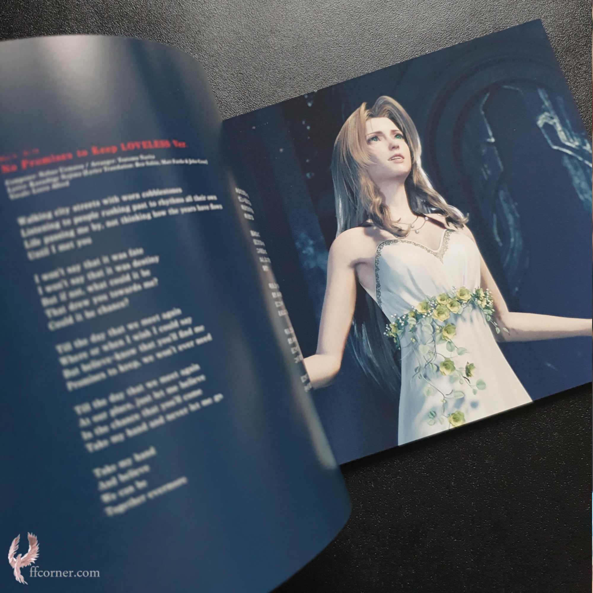 Der CD-Container im Innern ist aus Plastik und in bedruckten Karton eingefasst. Die CDs sind einzeln auf je einer Seite befestigt und lassen sich problemlos durchblättern. Bonus CD Nr. 8 befindet sich in einer separaten Papphülle. Zusätzlich ist ein mehrseitiges, großformatiges Hochglanzbooklet enthalten, dass neben einer Trackliste und vielen schönen Bildern aus dem Spiel auch die Lyrics zu Aeriths Song „No Promises to Keep“ enthält.